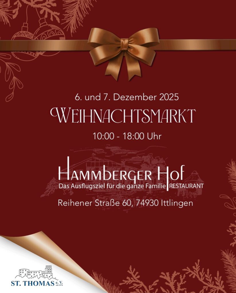 Am 6. und 7. Dezember 2025 verwandelt sich unser Restaurant Hammberger Hof in ein stimmungsvolles Weihnachtswunderland. Zwischen warmem Lichterglanz, weihnachtlichen Düften und liebevoll dekorierten Ständen laden wir Sie herzlich ein, Teil dieses besonderen Weihnachtsmarktes in Ittlingen zu sein.
